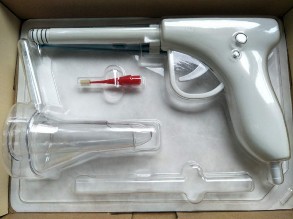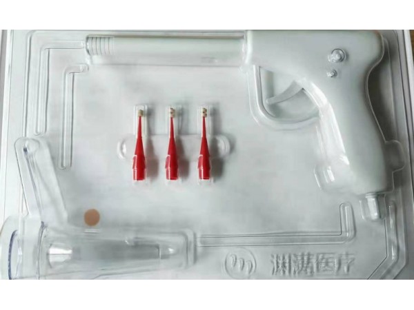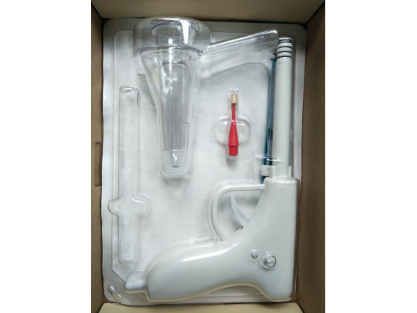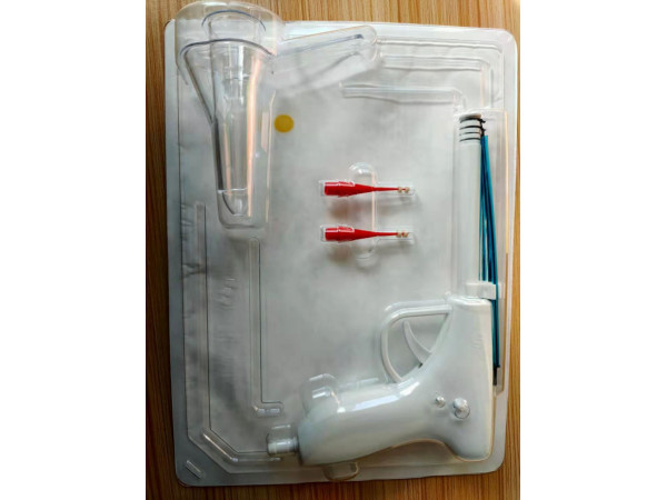 肛腸套扎器由槍體(內(nèi)置彈簧)、外槍管、內(nèi)槍管、硅膠圈(4個)、負壓吸引接頭 、繞線輪、套扎器開關和蓋帽組成。其中槍體(內(nèi)置彈簧)、負壓吸引接頭、繞線輪采用ABS塑料制成,外槍管、內(nèi)槍管、套扎器開關和蓋帽采用軟聚氯乙烯制成,硅膠圈采用醫(yī)用硅橡膠制成。產(chǎn)品應無菌。