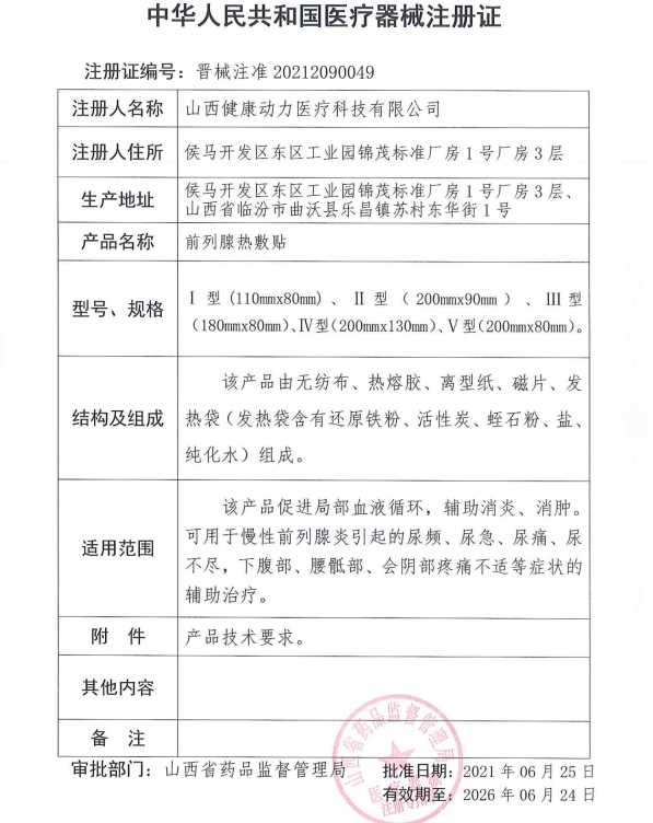 豫械注準(zhǔn)20252200161/鄭州康宜健醫(yī)療器械有限責(zé)任公司 有效期至:2030-03-02前列腺熱敷貼