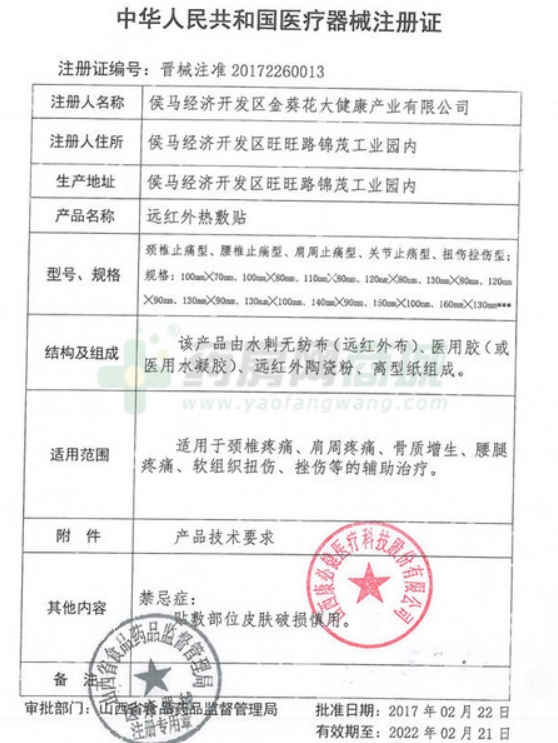 晉械注準(zhǔn)20172260117/山西健康動力醫(yī)療科技有限公司 有效期至:2022-12-12遠(yuǎn)紅外熱敷貼