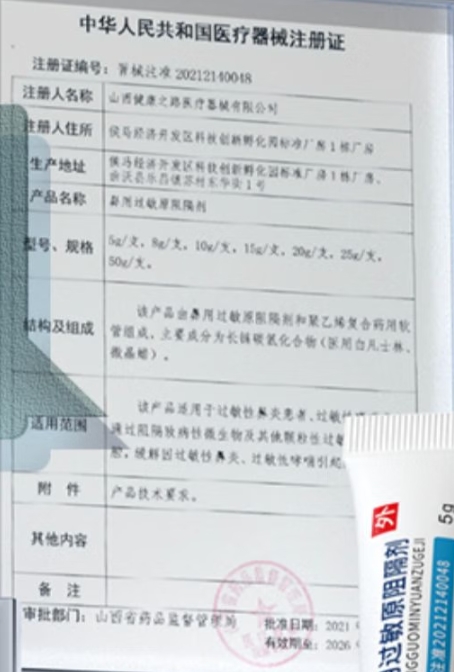 晉械注準(zhǔn)20242140046/山西健康之路醫(yī)療器械有限公司 有效期至:2029-03-19鼻用過敏原阻隔劑