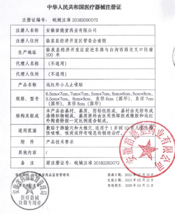 皖械注準20182560072/安徽苗德堂藥業(yè)有限公司 有效期至:2023-03-11遠紅外小兒止咳貼