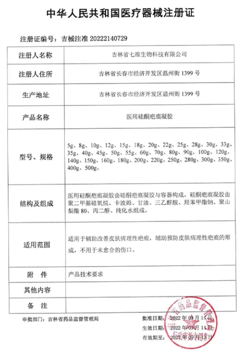 吉械注準(zhǔn)20232140132/吉林省恒瑞生物科技有限公司 有效期至:2028-02-29醫(yī)用硅酮疤痕凝膠