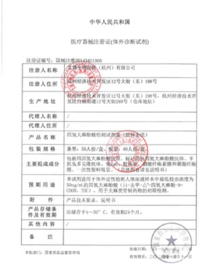 本試劑盒用于體外定性檢測人體尿液樣本中最低檢出濃度為50ngmL的四氫大麻酚酸(11-去甲-△9-四氫大麻酚-9-COOH,THC),用于大麻類管制藥物的初篩檢測。