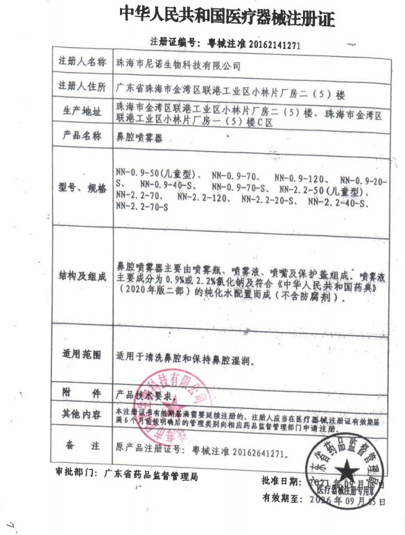 粵械注準(zhǔn)20162641271/珠海市尼諾生物科技有限公司 有效期至:2021-10-17鼻腔噴霧器