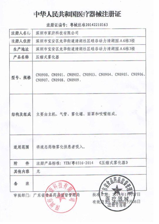 粵食藥監(jiān)械(準(zhǔn))字2014第2210383號(hào)/深圳市好一生電子科技有限公司 有效期至:2018-04-07壓縮式霧化器