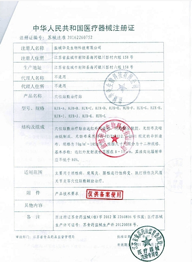 原注冊證蘇食藥監(jiān)械(準)字2012第2260806號作廢;醫(yī)療器械生產許可證號:蘇食藥監(jiān)械生產許20120058號。