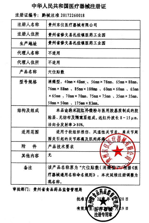 黔械注準20192090010/貴州東儀醫(yī)療器械有限公司 有效期至:2024-01-07穴位貼敷