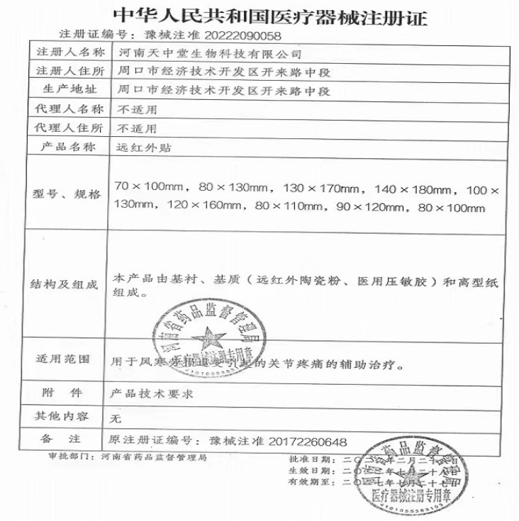 豫食藥監(jiān)械(準(zhǔn))字2012第2260270號(hào)/周口華東生物技術(shù)有限公司 有效期至:2016-10-22遠(yuǎn)紅外貼