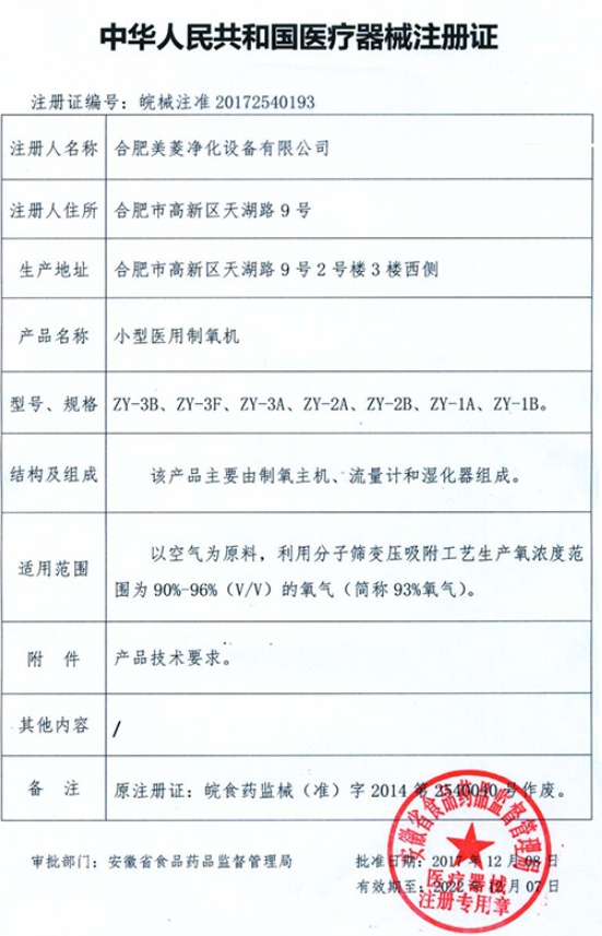 皖食藥監(jiān)械(準)字2014第2540040號/合肥美菱凈化設備有限公司 有效期至:2018-03-10小型醫(yī)用制氧機