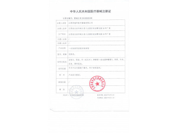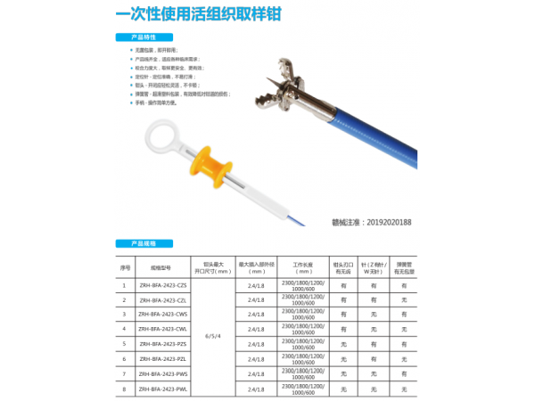 蘇械注準20192020178/揚州發(fā)特利醫(yī)療器械科技有限公司 有效期至:2029-02-25一次性使用活組織取樣鉗