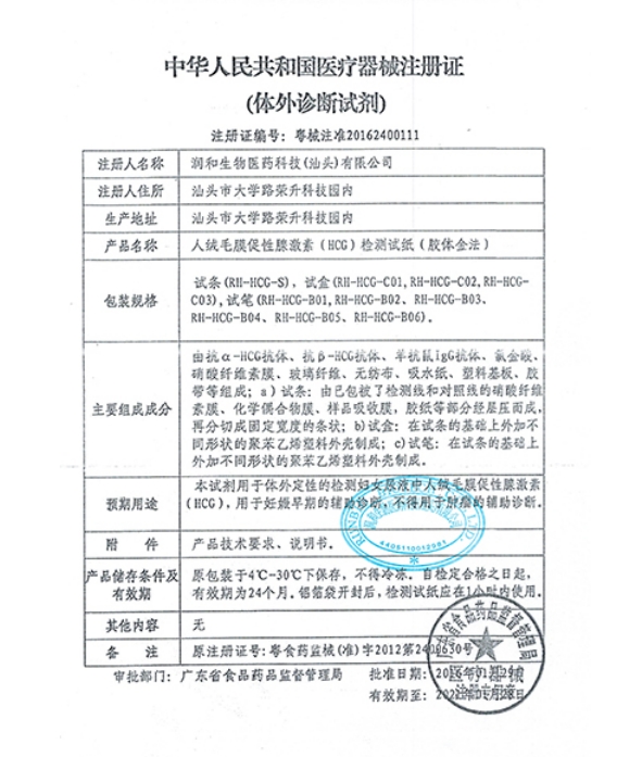 冀械注準(zhǔn)20152400159/河北博海生物工程開發(fā)有限公司 有效期至:2024-03-27人絨毛膜促性腺激素(HCG)檢測試紙(膠體金法)
