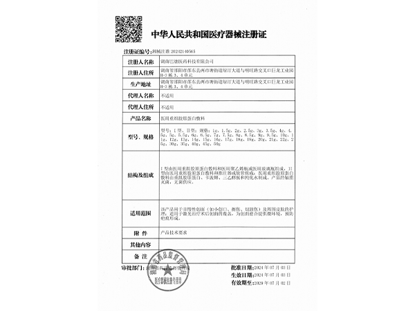 桂械注準(zhǔn)20232140076/廣西啟鳴生物藥業(yè)有限公司 有效期至:2028-04-26醫(yī)用重組膠原蛋白敷料