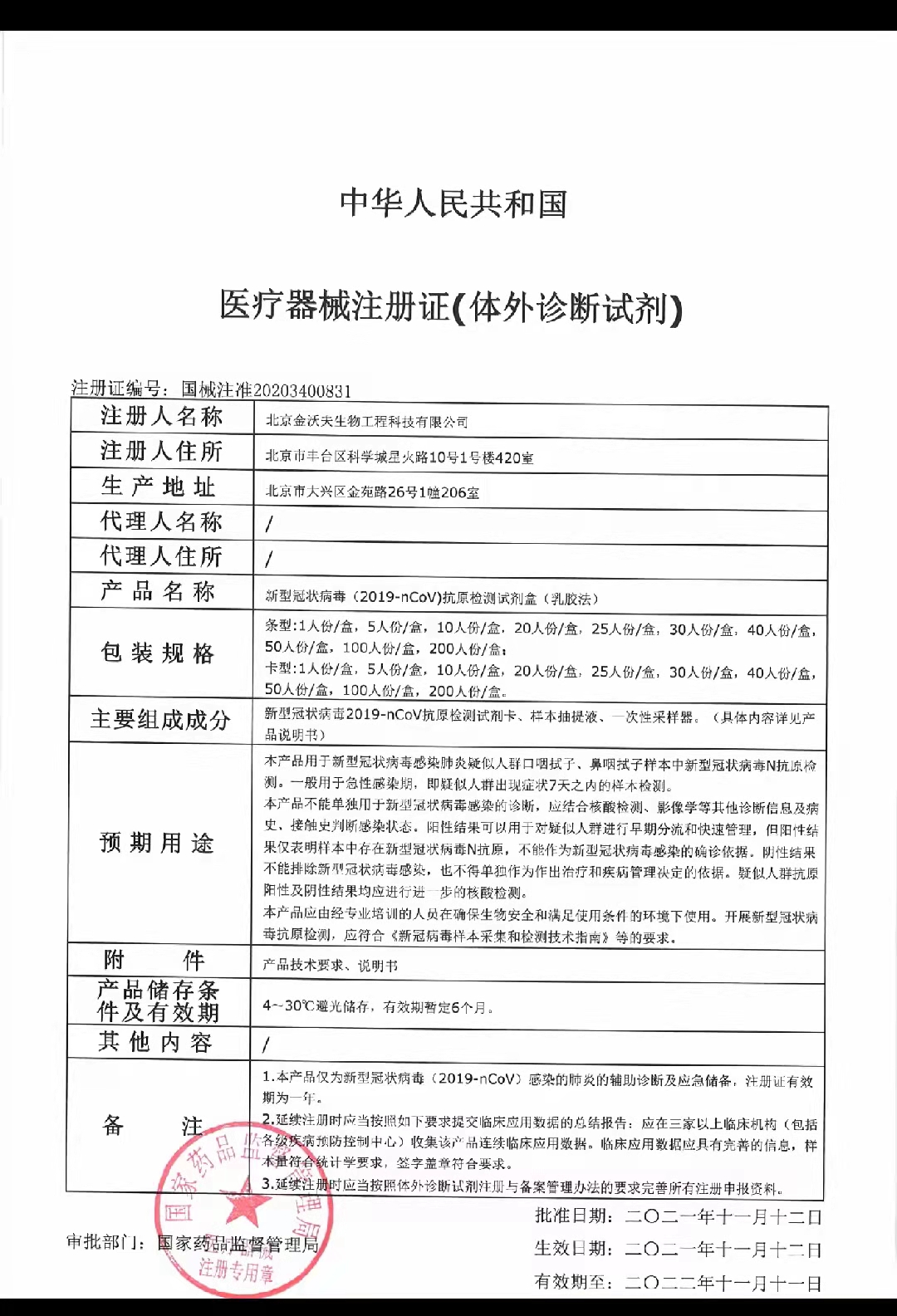2022-03-12 1、預(yù)期用途:由“本產(chǎn)品用于新型冠狀病毒感染肺炎疑似人群口咽拭子、鼻咽拭子樣本中新型冠狀病毒N抗原檢測(cè)。一般用于急性感染期,即疑似人群出現(xiàn)癥狀7天之內(nèi)的樣本檢測(cè)。本產(chǎn)品不能單獨(dú)用于新型冠狀病毒感染的診斷,應(yīng)結(jié)合核酸檢測(cè)、影像學(xué)等其他診斷信息及病史、接觸史判斷感染狀態(tài)。陽(yáng)性結(jié)果可以用于對(duì)疑似人群進(jìn)行早期分流和快速管理,但陽(yáng)性結(jié)果僅表明樣本中存在新型冠狀病毒N抗原,不能作為新型冠狀病毒感染的確診依據(jù)。陰性結(jié)果不能排除新型冠狀病毒感染,也不得單獨(dú)作為作出治療和疾病管理決定的依據(jù)。疑似人群抗原陽(yáng)性及陰性結(jié)果均應(yīng)進(jìn)行進(jìn)一步的核酸檢測(cè)。本產(chǎn)品應(yīng)由經(jīng)專業(yè)培訓(xùn)的人員在確保生物安全和滿足使用條件的環(huán)境下使用。開(kāi)展新型冠狀病毒抗原檢測(cè),應(yīng)符合《新冠病毒樣本采集和檢測(cè)技術(shù)指南》等的要求。”變更為“本產(chǎn)品用于定性檢測(cè)口咽拭子、鼻咽拭子和鼻拭子樣本中新型冠狀病毒(2019-nCoV)N抗原。適用人群參照《新冠病毒抗原檢測(cè)應(yīng)用方案(試行)》等國(guó)家相關(guān)規(guī)定執(zhí)行。本產(chǎn)品不能單獨(dú)用于新型冠狀病毒感染的診斷,應(yīng)結(jié)合核酸檢測(cè)、影像學(xué)等其他診斷信息及病史、接觸史判斷感染狀態(tài)。陽(yáng)性結(jié)果可以用于對(duì)疑似人群進(jìn)行早期分流和快速管理,但陽(yáng)性結(jié)果僅表明樣本中存在新型冠狀病毒抗原,不能作為新型冠狀病毒感染的確診依據(jù)。陰性結(jié)果不能排除新型冠狀病毒感染,也不得單獨(dú)作為作出治療和疾病管理決定的依據(jù)。疑似人群抗原陽(yáng)性及陰性結(jié)果均應(yīng)進(jìn)行進(jìn)一步的核酸檢測(cè)。檢測(cè)陽(yáng)性受試者應(yīng)遵循當(dāng)?shù)匾咔榉揽卣哌M(jìn)行報(bào)告和隔離,并尋求相應(yīng)的醫(yī)療幫助;檢測(cè)陰性受試者應(yīng)嚴(yán)格遵守當(dāng)?shù)匾咔榉揽匾螅匾獣r(shí)進(jìn)一步采取其他更靈敏的檢測(cè)方法進(jìn)行確認(rèn),若仍為陰性應(yīng)持續(xù)進(jìn)行監(jiān)測(cè),并及時(shí)尋求醫(yī)療幫助。產(chǎn)品使用環(huán)境應(yīng)遵循《新型冠狀病毒抗原檢測(cè)應(yīng)用方案(試行)》等國(guó)家相關(guān)規(guī)定?!?、主要組成成分:增加“生物安全袋。(具體內(nèi)容詳見(jiàn)產(chǎn)品說(shuō)明書(shū))”3、產(chǎn)品說(shuō)明書(shū)中內(nèi)容的更改,具體內(nèi)容見(jiàn)附件。請(qǐng)注冊(cè)人依據(jù)變更批件及附件自行修訂相關(guān)內(nèi)容。rn2022-03-15 “注冊(cè)人住所:北京市豐臺(tái)區(qū)科學(xué)城星火路10號(hào)1號(hào)樓420室”變更為“注冊(cè)人住所:北京市大興區(qū)中關(guān)村科技園區(qū)大興生物醫(yī)藥產(chǎn)業(yè)基地華佗路50號(hào)院23號(hào)樓一層101”。 rn2022-04-25 產(chǎn)品儲(chǔ)存條件和/或有效期的變更,具體內(nèi)容見(jiàn)附件。產(chǎn)品說(shuō)明書(shū)變更,具體內(nèi)容見(jiàn)附件。 rn2022-11-10 說(shuō)明書(shū)和產(chǎn)品技術(shù)要求變更,具體內(nèi)容詳見(jiàn)附件,請(qǐng)注冊(cè)人依據(jù)變更批件及其附件自行修訂產(chǎn)品說(shuō)明書(shū)、技術(shù)要求中相關(guān)內(nèi)容。 rn2022-12-13 “生產(chǎn)地址:北京市大興區(qū)金苑路26號(hào)1幢206室”變更為“生產(chǎn)地址:北京市大興區(qū)金苑路26號(hào)1幢206室 北京市大興區(qū)金苑路26號(hào)1號(hào)樓A、B、C座5層”。 rn2023-02-22 注冊(cè)人住所由北京市大興區(qū)中關(guān)村科技園區(qū)大興生物醫(yī)藥產(chǎn)業(yè)基地華佗路50號(hào)院23號(hào)樓一層101;變更注冊(cè)證載明的生產(chǎn)地址由北京市大興區(qū)金苑路 26 號(hào) 1 幢 206 室,北京市大興區(qū)金苑路 26 號(hào) 1 號(hào)樓 A、B、C 座 5 層;注冊(cè)人住所變更為:北京市大興區(qū)經(jīng)濟(jì)開(kāi)發(fā)區(qū)科苑路18號(hào)3幢二層R2215室;生產(chǎn)地址變更為:北京市大興區(qū)金苑路 26 號(hào) 1 幢 206 室,北京市大興區(qū)金苑路 26 號(hào) 1 號(hào)樓 A、B、C 座 5 層,北京市大興區(qū)華佗路 50 號(hào)院 23 號(hào)樓 1 層 102-103 室、2 層、3 層、4 層