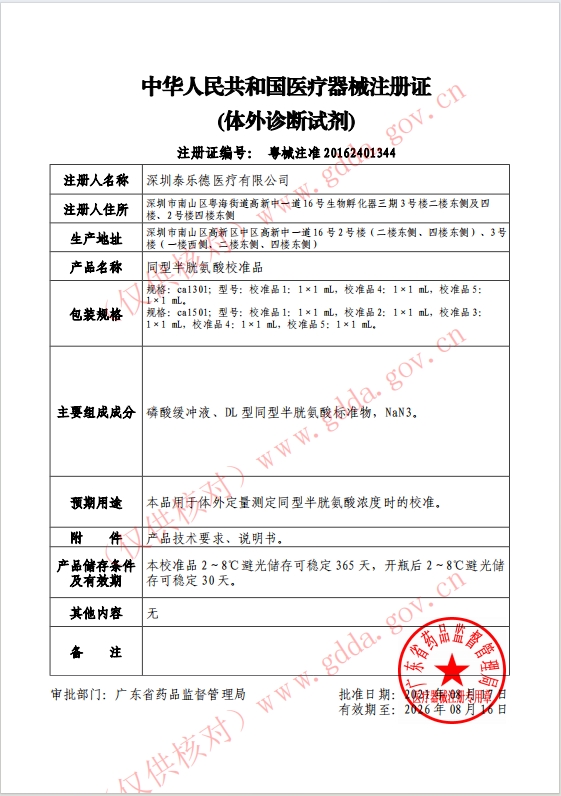 粵械注準(zhǔn)20162401344(變更文件)/深圳奧薩醫(yī)療有限公司 有效期至:2021-10-24同型半胱氨酸校準(zhǔn)品
