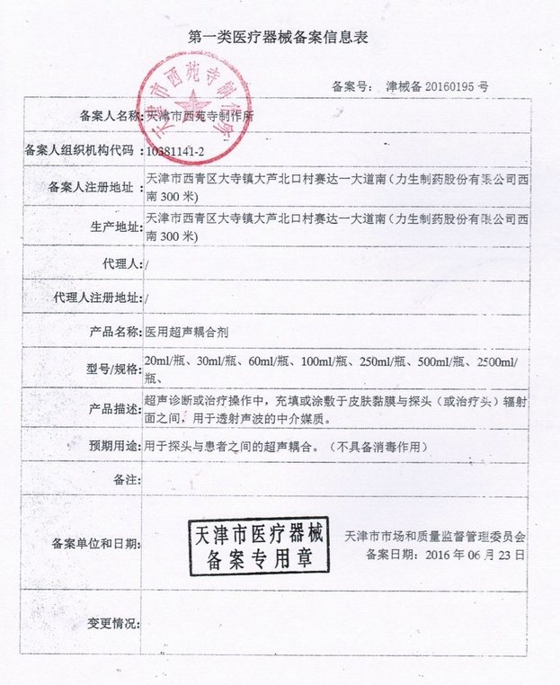 津食藥監(jiān)械(準)字2012第1230001號/天津市南開區(qū)華科醫(yī)療器械廠 有效期至:2016-04-19醫(yī)用超聲耦合劑