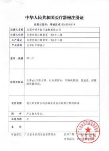 桂械注準(zhǔn)20202070155/廣西中恒醫(yī)療科技有限公司 有效期至:2026-05-13醫(yī)用紅外額溫計(jì)
