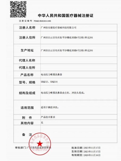 桂械注準(zhǔn)20232140184/杉源(廣西)醫(yī)療科技有限公司 有效期至:2028-08-28電動(dòng)壓力噴霧洗鼻器