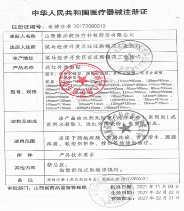 晉械注準(zhǔn)20172260013/侯馬經(jīng)濟(jì)開發(fā)區(qū)金葵花大健康產(chǎn)業(yè)有限公司 有效期至:2022-02-21遠(yuǎn)紅外熱敷貼