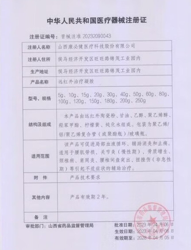 晉械注準(zhǔn)20242090237/山西簡(jiǎn)潔衛(wèi)材有限公司 有效期至:2029-12-30遠(yuǎn)紅外治療凝膠
