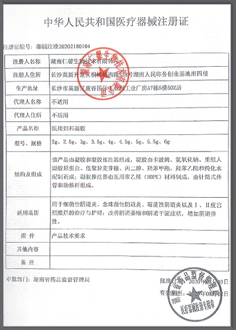 湘械注準(zhǔn)20222181490/湖南有美生物科技有限公司 有效期至:2027-08-04醫(yī)用婦科凝膠