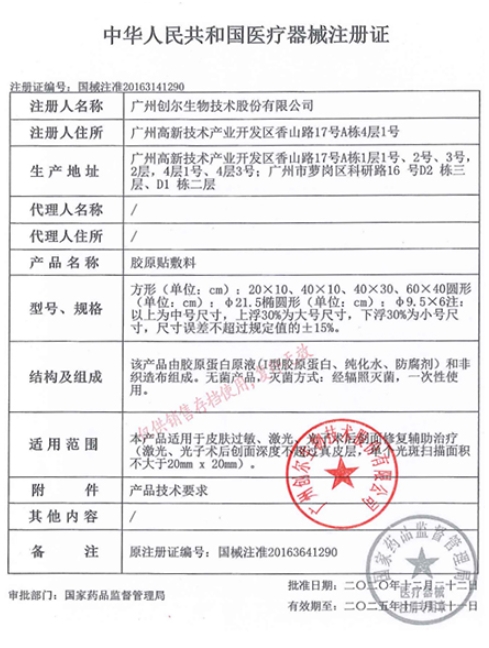 國(guó)械注準(zhǔn)20163641290/廣州創(chuàng)爾生物技術(shù)股份有限公司 有效期至:2021-07-11膠原貼敷料