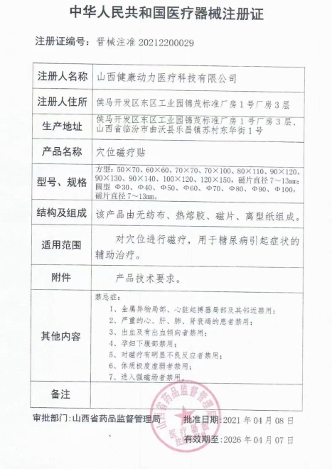 晉械注準(zhǔn)20212200009/山西健康動(dòng)力醫(yī)療科技有限公司 有效期至:2026-01-13穴位磁療貼