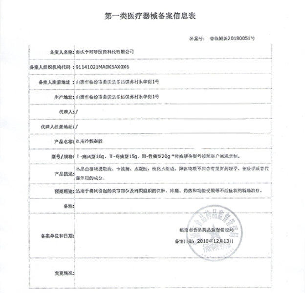 晉臨械備20200007號(hào)/曲沃李時(shí)珍醫(yī)藥科技有限公司醫(yī)用冷敷凝膠
