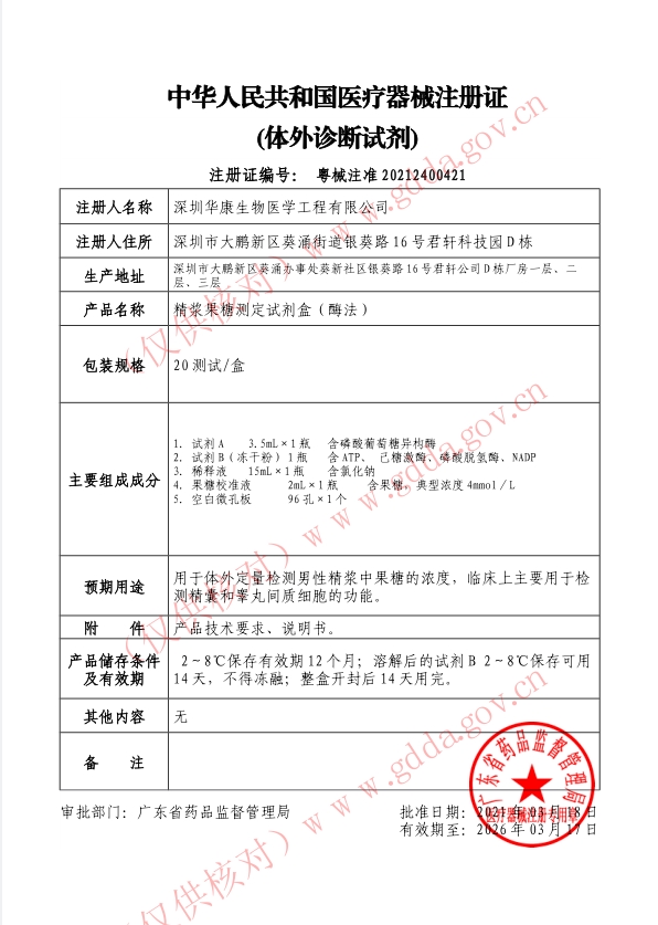 用于體外定量檢測(cè)男性精漿中果糖的濃度,臨床上主要用于檢測(cè)精囊和睪丸間質(zhì)細(xì)胞的功能。