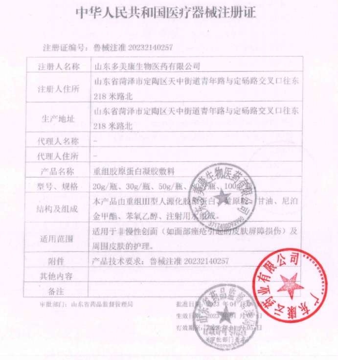 滬械注準20242140230/上海迪派生物科技有限公司 有效期至:2029-07-14重組膠原蛋白凝膠敷料