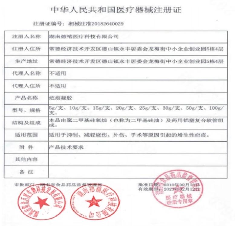 湘械注準20222142018/湖南健維科技發(fā)展有限公司 有效期至:2027-11-03疤痕凝膠