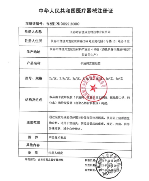 吉械注準20222180459/吉林邦美醫(yī)藥生物科技有限公司 有效期至:2027-07-12卡波姆宮頸凝膠