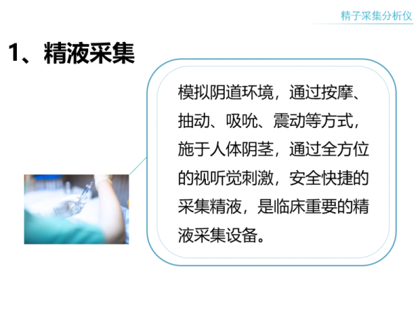 精子采集分析儀SW-3701 儀器簡(jiǎn)介: 集現(xiàn)代數(shù)字技術(shù)、自動(dòng)控制技術(shù)及仿真技術(shù)于一體,具備精液采集和早泄脫敏訓(xùn)練功能。 儀器特點(diǎn): 1、仿真陰道環(huán)境,采精過程舒適愉悅 2、提供全方位的視覺、聽覺刺激 3、專用采精套,杜絕精液污染 4、全方位隔離措施,杜絕交叉感染 治療功能: 精液采集,模擬陰道環(huán)境,通過按摩、抽動(dòng)、吸吮、震動(dòng)等方式,施于人體陰莖,能夠安全快捷的采集精液,是臨床最理想的精液采集設(shè)備;早泄脫敏訓(xùn)練,對(duì)陰莖龜頭進(jìn)行反復(fù)沖擊摩擦,以降低性神經(jīng)末梢的興奮度,鈍化陰莖龜頭、冠狀溝、陰莖體表面神經(jīng),調(diào)節(jié)性神經(jīng)中樞,以達(dá)到降低性神經(jīng)敏感度,提高射精閾值,達(dá)到治療早泄的目的。