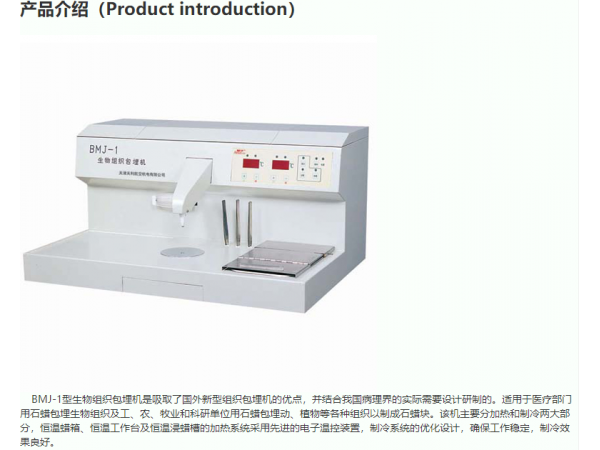 產(chǎn)品標(biāo)準(zhǔn):YZB/津?yàn)I0009-2013產(chǎn)品性能結(jié)構(gòu)及組成產(chǎn)品性能結(jié)構(gòu)及組成:本產(chǎn)品是由制冷臺、恒溫蠟箱及電器控制系統(tǒng)組成。BMJ-1型生物組織包埋機(jī)為制冷加熱一體式,BMJ-1B型生物組織包埋機(jī)是在BMJ-1型的基礎(chǔ)上將制冷、加熱一體式更改為制冷、加熱分體式。產(chǎn)品性能:1、工作條件:a)環(huán)境溫度:5℃~40℃;b)相對濕度:不大于80%。2、額定電源:AC220,50HZ。3、開機(jī)后,數(shù)碼管(或液晶屏)顯示正常;電源指示燈亮。4、制冷溫度:在不大于20℃的室溫下制冷平臺表面中心點(diǎn)的溫度開機(jī)運(yùn)行30min后應(yīng)不高于0℃。5、恒溫箱溫度:在20℃±2℃的室溫下,恒溫箱的調(diào)溫范圍40℃~80℃,溫控精度±5℃。6、在20℃±2℃的室溫下,工作平臺溫度應(yīng)為:60℃~85℃范圍內(nèi)。7、預(yù)熱槽溫度:在20℃±2℃的室溫下,預(yù)熱槽的調(diào)溫范圍為40℃~80℃,溫控精度±5℃。流蠟裝置應(yīng)暢通,無泄漏,開關(guān)裝置靈敏。9、包埋機(jī)在運(yùn)轉(zhuǎn)的情況下,噪聲應(yīng)小于60dB(A)。其他性能指標(biāo)詳見注冊產(chǎn)品標(biāo)準(zhǔn)《生物組織包埋機(jī)》。規(guī)格型號:(1)BMJ-1型;(2)BMJ-1B型