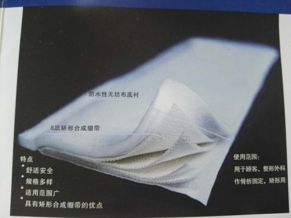 產(chǎn)品特點: 1、 硬度高、質(zhì)量輕:經(jīng)檢測固話后的聚氨酯繃帶硬度是傳統(tǒng)石膏的20倍,這一特點保證了聚氨酯醫(yī)用高分子夾板有可靠牢固的固定作用;固定用材少,重量輕,相當于石膏重量的1/5,厚度的1/3,可使患處負重小,對固定后功能鍛煉減輕了負荷,有利于血液循環(huán),促使愈合; 2、 良好的透氣性:繃帶使用了高質(zhì)量的原紗,獨有的網(wǎng)狀編制技術(shù),使形成的聚氨酯醫(yī)用高分子繃帶具有良好的透氣性,有利于皮膚透氣;