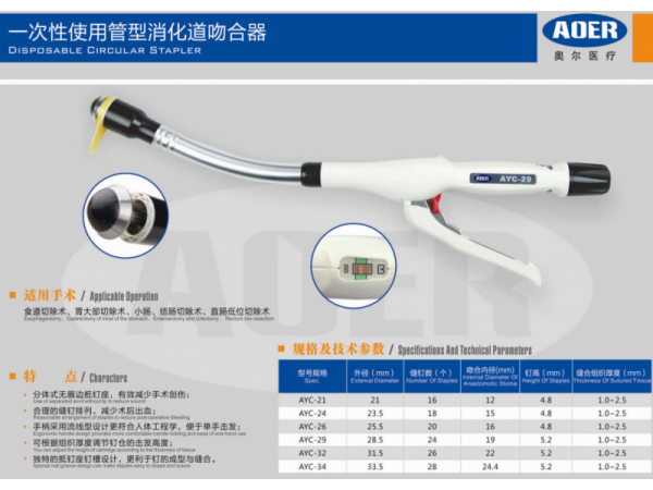 一次性使用管型消化道吻合器適用范圍:適用于食管、胃、腸等消化道重建手術(shù)中的端端吻合、端側(cè)吻合和側(cè)側(cè)吻合。產(chǎn)品特點:1. 扁