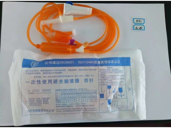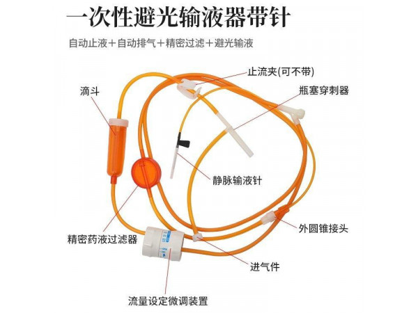 本產(chǎn)品由瓶塞穿刺器、滴斗、導(dǎo)管、流量調(diào)節(jié)器、藥液過濾器、錐頭等組成,帶有或不帶有一次性輸液針。輸液器材料為PVC和避光劑。避光性能:290~450nm波長范圍內(nèi)的光的透光率:滴斗≤35%;軟管≤15%。