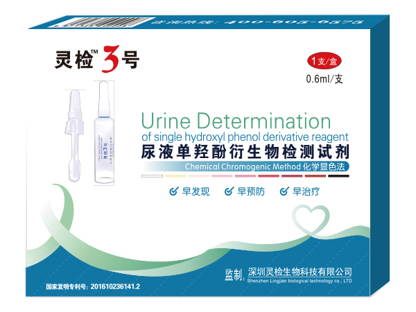 靈檢三號(hào),即尿液?jiǎn)瘟u酚衍生物檢測(cè)試劑,是靈檢生物研發(fā)的一種用于早期發(fā)現(xiàn)腫瘤的癌癥尿液檢測(cè)試劑,準(zhǔn)確率高達(dá)96.8%,整個(gè)檢測(cè)