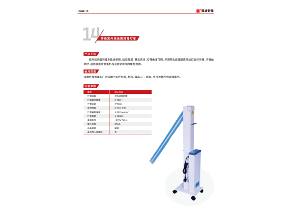 產(chǎn)品特性1.通過了歐盟CE安全合格產(chǎn)品質(zhì)量認(rèn)證。2.符合消毒技術(shù)規(guī)范合車。3.紫外線消毒燈車采用金屬制成雙燈管結(jié)構(gòu),直接照射式消