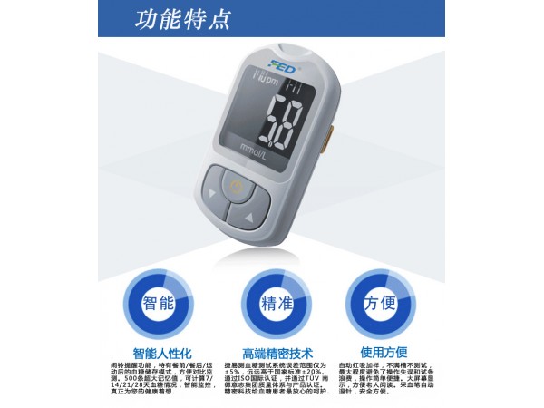 本產(chǎn)品在設(shè)計方面注重方便、快捷、準確以及人性化的特點,與FED型血糖測試條配合,用于常規(guī)血糖監(jiān)測,10秒鐘快速顯示結(jié)果。捷易測血糖檢測系統(tǒng)檢測結(jié)果與實驗室標準測量結(jié)果具有高度一致性,完全滿足并超過ISO15197-2003國際標準和GB/T19634-2005國家標準的要求。