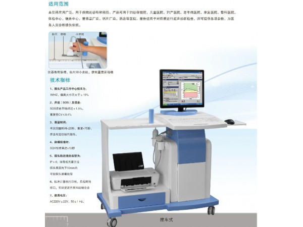 超聲骨密度分析儀一、技術(shù)特點(diǎn)★無(wú)輻射,無(wú)創(chuàng)傷,適用于兒童、孕婦和老年人的骨密度檢查★操作快速且簡(jiǎn)單,儀器備有標(biāo)尺,精確定
