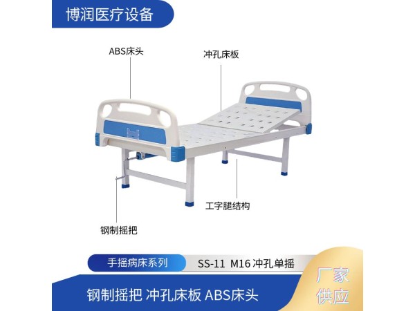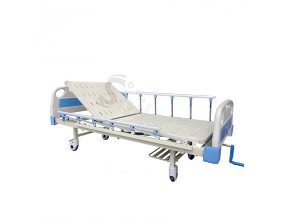 ABS Sing-crank Manul Care BedSpecification:2120*970*485mm (L*W*H)Description: Single-crank, epoxy coated frame, aluminum side rails, self-protectde system of the crank, skidproof and waterproof feet covers. ABS board of bed head and foot.The bed surface is made of imported cold steel plate by impact molding, to remove rust by ultrasonic, and coated by electrostatic powder coatings spraying to beanti-impact and fadeless. Option:Deluxe castor, over-bedtable