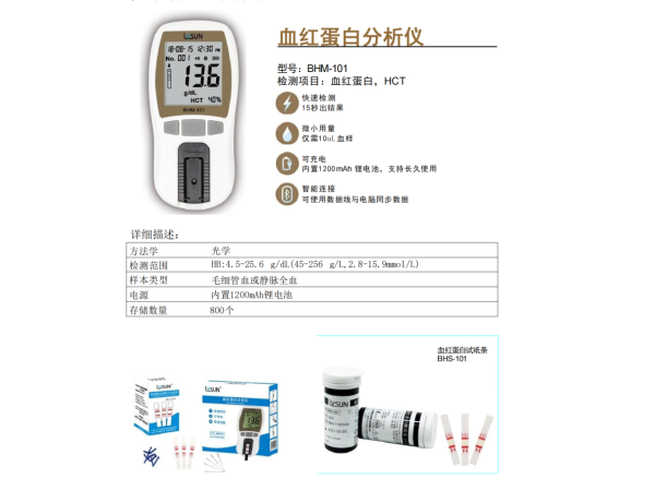 主要技術(shù)參數(shù)與性能指標(biāo)內(nèi)容 說(shuō)明測(cè)試范圍 4.5g/dL~25.6g/dL樣本類型 全血(毛細(xì)血管全血或靜脈全血)檢測(cè)時(shí)間 少于 15 秒樣本