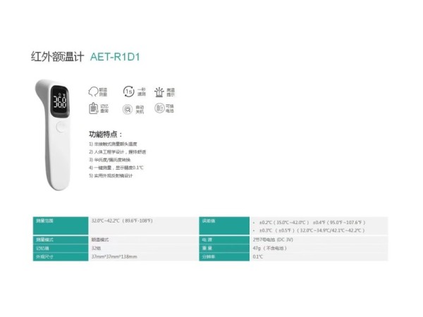 產(chǎn)品標(biāo)準(zhǔn):YZB/粵0231-2012《紅外額溫計(jì)》產(chǎn)品介紹:童樂”紅外體溫計(jì),掌握紅外核心技術(shù),專門針對亞洲人種開發(fā),精準(zhǔn)測量發(fā)熱人群。一秒鐘快速準(zhǔn)確測量,人性設(shè)計(jì)、便于操作,也可用于在家庭、醫(yī)院等公共場合測量體溫及環(huán)境溫度,且產(chǎn)品適用于老人、兒童、中青年等各類人群。產(chǎn)品性能結(jié)構(gòu)及組成:主要由測溫頭、START測量按鈕、開關(guān)機(jī)鍵、顯示屏、電池蓋、機(jī)身組成。規(guī)格型號(hào):AET-R161、AET-R171