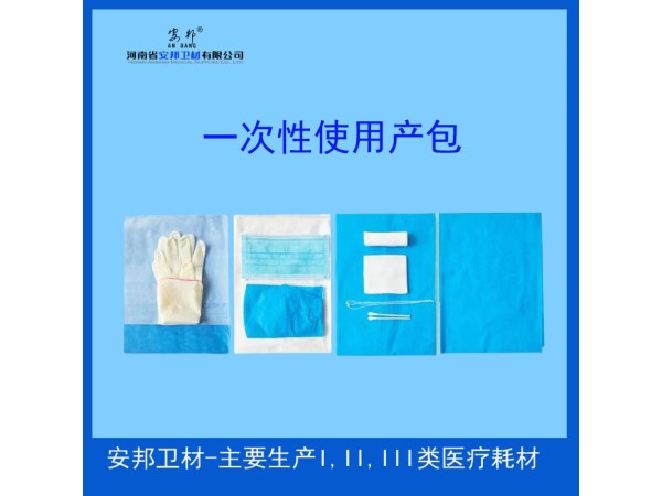 該產(chǎn)品分為自然分娩產(chǎn)包、流產(chǎn)包由手術(shù)衣、口罩、帽、中單、尿布、產(chǎn)墊、會陰墊、腿套、包布、洞巾、換藥碗、紗布塊(墊)、鑷子、肚臍繩、一次性使用橡膠外科手套組成。
