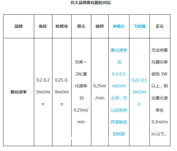 霧化速率過慢,達不到治療效果;霧化速率過快,又易使霧化顆粒凝結(jié)成水珠,掛在呼吸面罩上面。且速率過快,患者霧化過程中也易產(chǎn)生嗆咳發(fā)生危險。唯有合適的霧化速率,吸收治療效果才能更好。那怎樣的霧化速率比較合適呢?研究證明,兒童霧化速率0.3ml/min左右,成人霧化速率0.5ml/min,霧化過程較為舒適,并且效果好。如果霧化速率跨度過大也并不適合選擇,跨度大出霧不夠集中,治療效果也相對較差。以下數(shù)據(jù)表明,來福士和飛利浦的相對更為適合選擇。