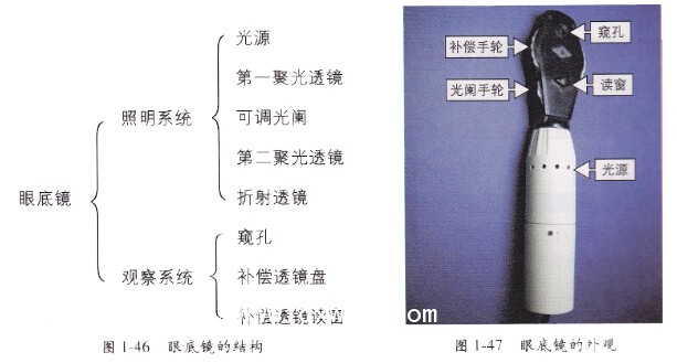 眼底鏡的結(jié)構(gòu)包括照明系統(tǒng)和觀察系統(tǒng)兩部分,照明系統(tǒng)包括光源、第一聚光透鏡可調(diào)光闌、第二聚光透鏡和折射透鏡等組件;觀察系統(tǒng)包括窺孔、補(bǔ)償透鏡盤和補(bǔ)絮透鏡讀窗等組件(見圖1—46),外觀如圖1_47所示。