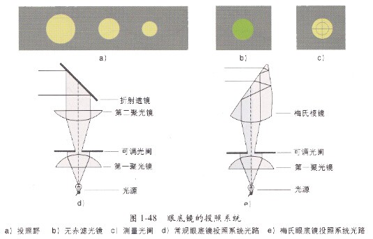 6)眼底鏡的投照系統(tǒng)光路。常規(guī)眼底鏡光源位于第一聚光鏡第一主焦點(diǎn),光線射出第一聚光鏡為平行光線到達(dá)可調(diào)光闌,可調(diào)光闌位于第二聚光鏡的第一主焦點(diǎn),光線射出第二聚光鏡仍然為平行光線到達(dá)折射鏡,通過折射鏡改變投射方向,光線以平行狀態(tài)投射被測(cè)眼(見圖1-48d)。梅氏眼底鏡的第二聚光鏡與折射三棱鏡連為一體,形成照明系統(tǒng)的樞紐裝置(見圖1—48e),由于加工精度要求較高,現(xiàn)多已棄用。