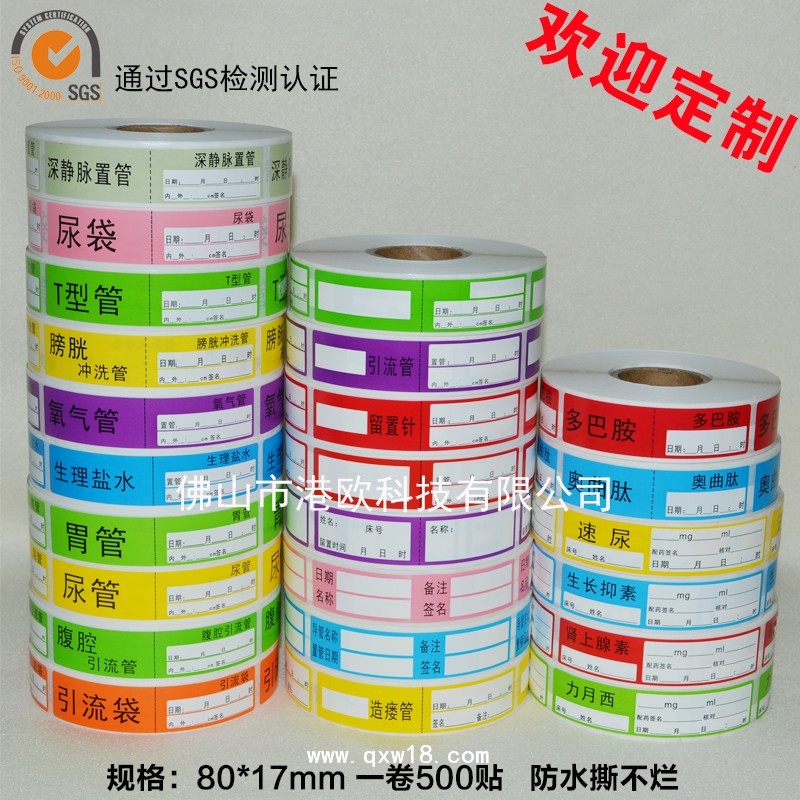 醫(yī)用標(biāo)簽尺寸:長80*寬17mm規(guī)格多種顏色:綠色/紅色/黃色/藍(lán)色/灰色多種色可按要求定做和選購。包裝:500個一卷或680個一卷可訂制性能:PP合成材料,粘性強(qiáng),撕不壞,防水防酒精,可保存三年以上