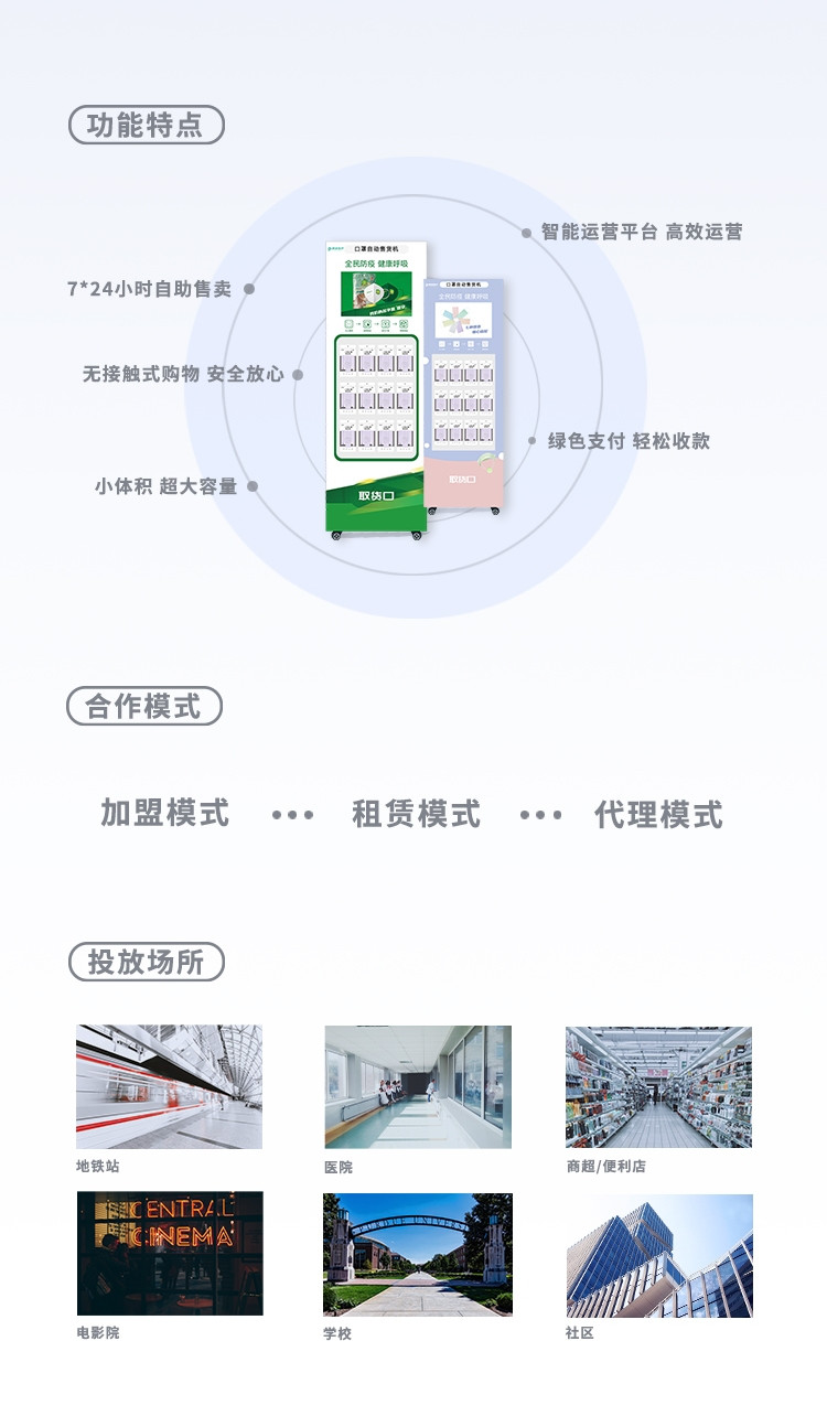 無接觸產(chǎn)品自動售貨機放在醫(yī)院、機場、高鐵、地鐵站及各類公共場所,在將來的很多年,都會有不錯的效益,而且疫情把口罩在大家心中的心里價位提到了價格,利潤率也會非常有保證,如果再加上點防護(hù)消毒洗手液、消毒濕巾、防護(hù)手套等等一起出售,花幾十元,可以和病毒進(jìn)行隔絕,相信受眾人群一大把。