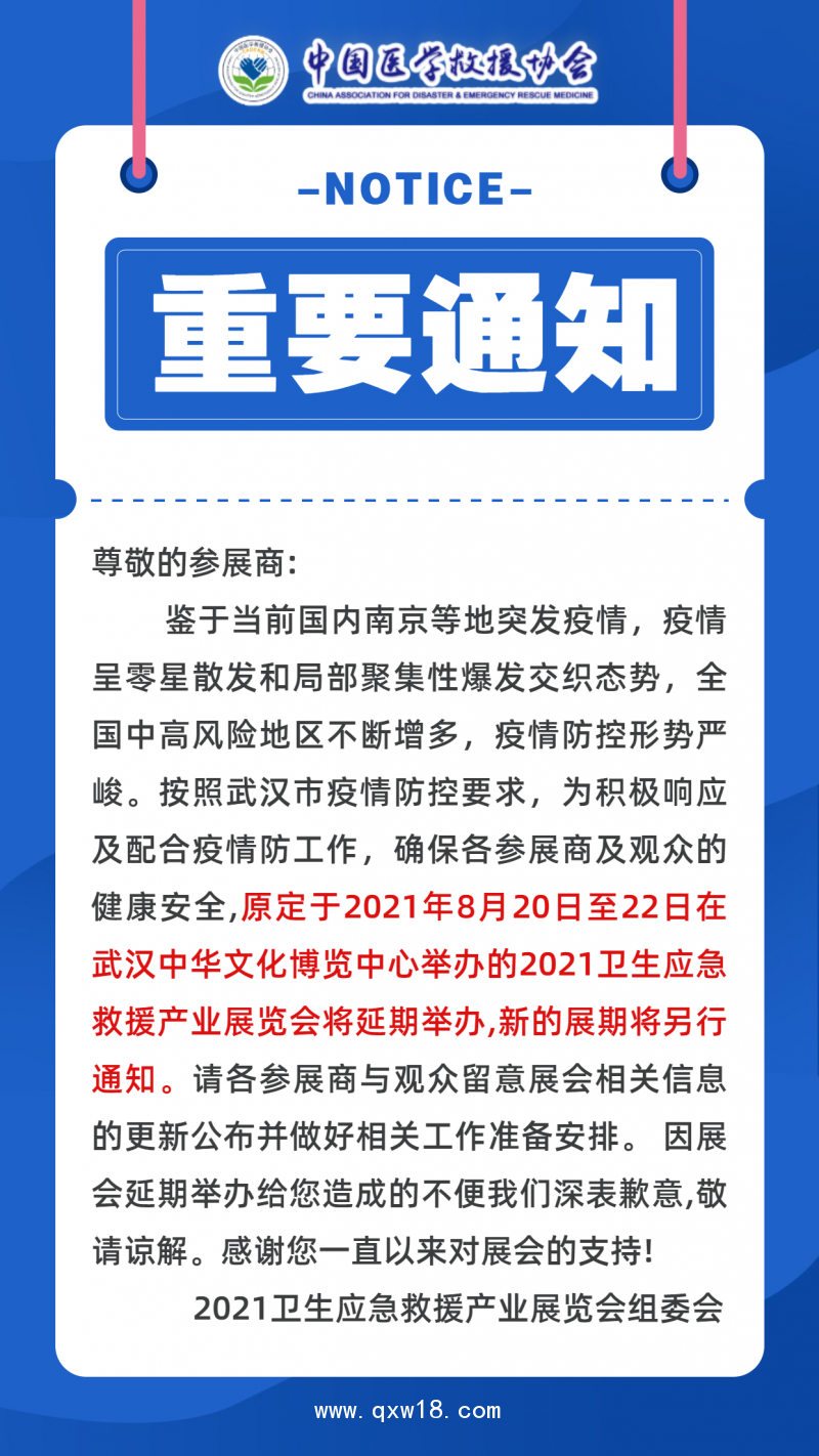 2021衛(wèi)生應(yīng)急救援產(chǎn)業(yè)展覽會(huì)暨第18屆現(xiàn)代救援醫(yī)學(xué)論壇延期通知